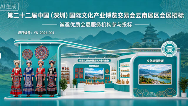 采购需求:负责第二十二届中国(深圳)国际文化产业博览交易会云南展区的组织服务,包括但不限于:组织云南省重大文化产业项目、特色文化产品参展,云南展区展台的设计、搭建,组织特色文艺演出,组织考察调研,组织媒体进行宣传,展览期间的会展服务,展览期间举办招商引资活动,承担含云南展区场地租赁费、展位吊点及形象展示柱、聘请相关劳务工作人员、安保措施在内的所有与承办相关的费用。;