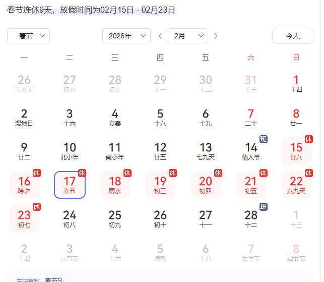 二、春节:2月15日(农历腊月二十八、周日)至23日(农历正月初七、周一)放假调休,共9天。2月14日(周六)、2月28日(周六)上班。