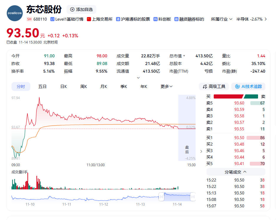 东芯股份今日股市东盟网截图人民财讯11月14日电,11月14日,东芯股份举办2025年第三季度业绩说明会,公司高管表示,近期随着市场的持续回暖,存储产品市场价格逐步回升,对公司产品销售价格产生积极影响。公司会持续关注市场需求的变化,积极调整销售策略,优化运营效率。另外,公司持续布局网络通信、监控安防、消费电子、