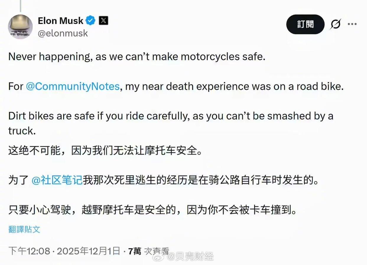 #特斯拉不会进军摩托车市场#【#马斯克解释特斯拉为何不做摩托车#:无法确保安全,之前骑公路车差点命丧黄泉】X 平台用户 @Moandbhr 昨天发布了一段“马斯克骑单轮摩托车”的 AI 视频,并配文称“埃隆・马斯克先生刚发布了颠覆行业的特斯拉摩托车”,引发网友热议。